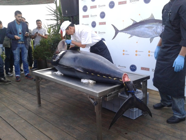 Se trataba de asistir en directo al desuello de un atún, por el maestro ronqueador Tajiri Nobuyuki, y descubrir las diferentes piezas de un atún rojo del mediterráneo.